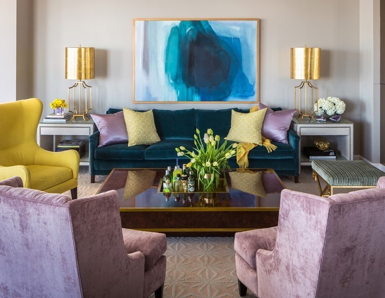 客厅也充满了深海蓝和金色, 但更多的是柔和的一面。看玄关浮躁不安,深入了解客厅其实也有柔情的一面。