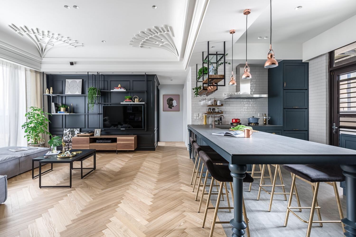 在空间配置上,为了营造出古典酒吧的放松轻快感受,以三米四长的中岛设计及开放式设计,作为餐厅与厨房的场域及功能整合,而上方采用悬挂铁件吊柜,舍弃厚重压迫的桶身存在,为轻工业韵味留有一处伏笔,也让视觉感受更轻盈舒适,搭配着轻松惬意的高脚吧台椅,使用餐者与烹调者的距离不因空间及软件而受到限制,除了便于参与互动之外,更利于创造双方的话题。
