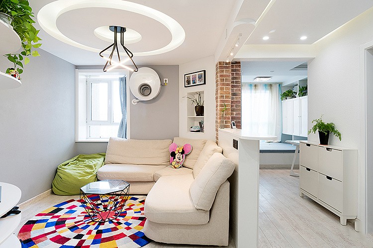 进入到客厅中,映入眼前依靠在转角处的米色沙发看上去十分素雅。原本狭小的空间重新规划后,视野宽阔,得到了极大化的利用。砖石型的茶几显得落落大方。圆形灯带吊顶,搭配线条简洁的吊灯,可以增添空间活力。