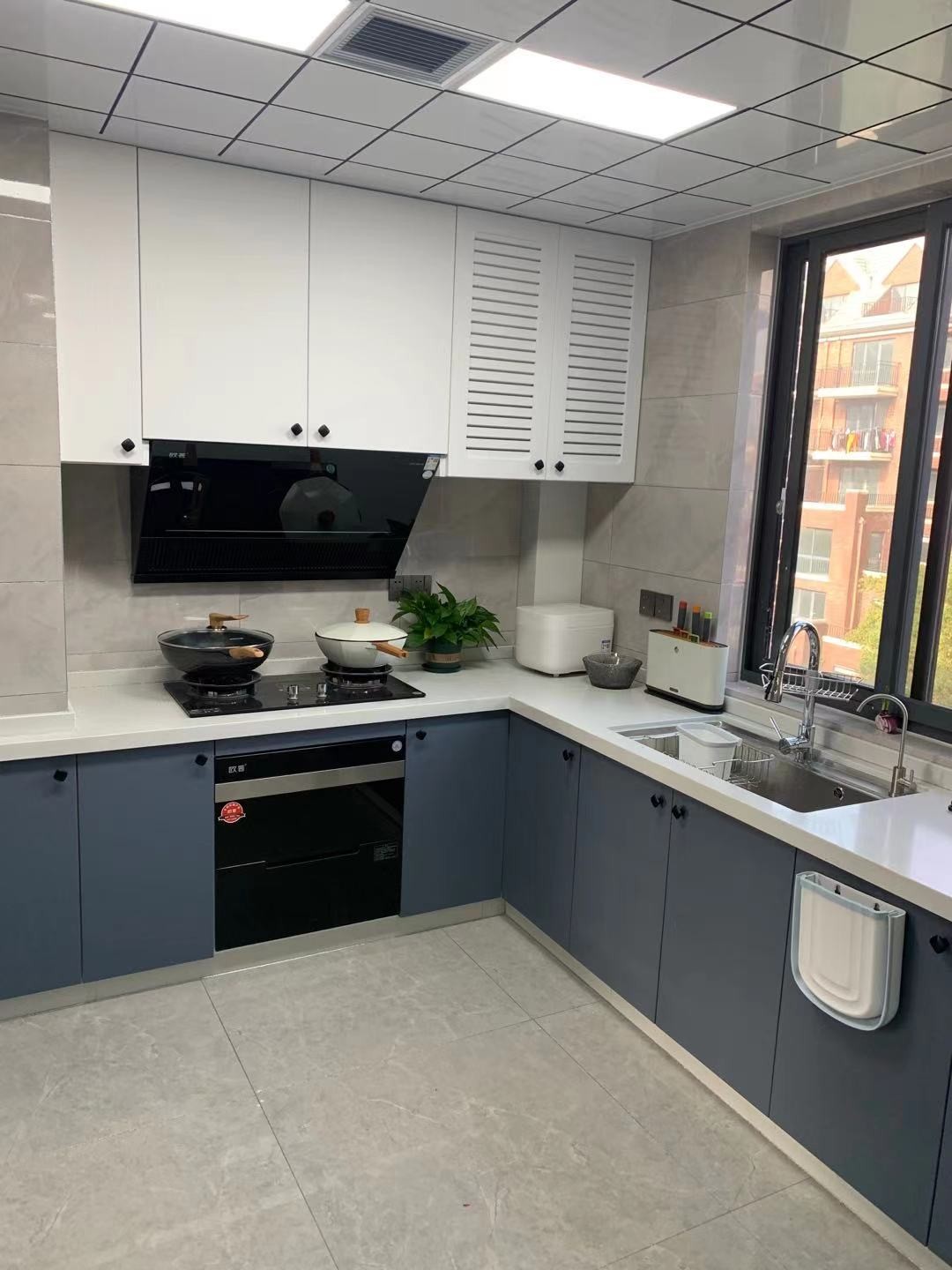 柜子现场打造,采用上下分色的柜门