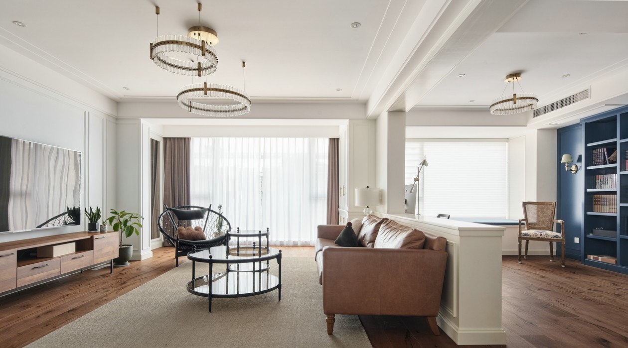 开放式的空间布局纳入更多自然清气,空间通透而明亮,大面积的白色作为基底,配以原木地板及棕色皮质家具来丰富空间的质感,充满活力的蓝色点缀其中,搭配去繁从简的留白艺术,可以大大满足城市人对于自然生活的期待。