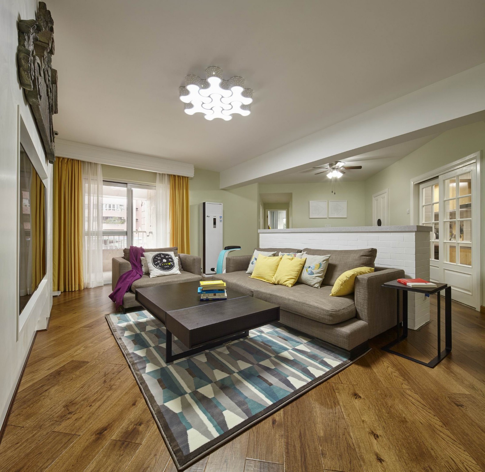 客厅区域利用哑口与墙之间的距离做了整面墙的定制柜开放格,可容纳孩子大量的书籍,也可展示一些收藏,具有很强实用性。地面铺贴了略带结疤的实木地板,地板呈现出原始的纹理与颜色,体现出自然之美。