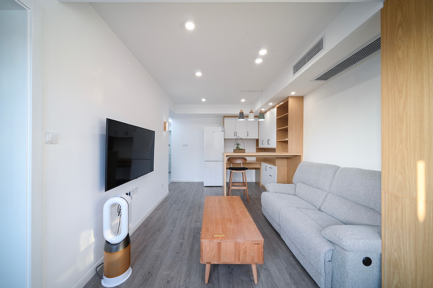 客厅设计追求一种淡雅深邃的意味,化繁为简,摈弃过多的修饰,大面积原木色与白色结合,搭配清新自然、线条简洁的家具,达到一个舒适的居住状态。