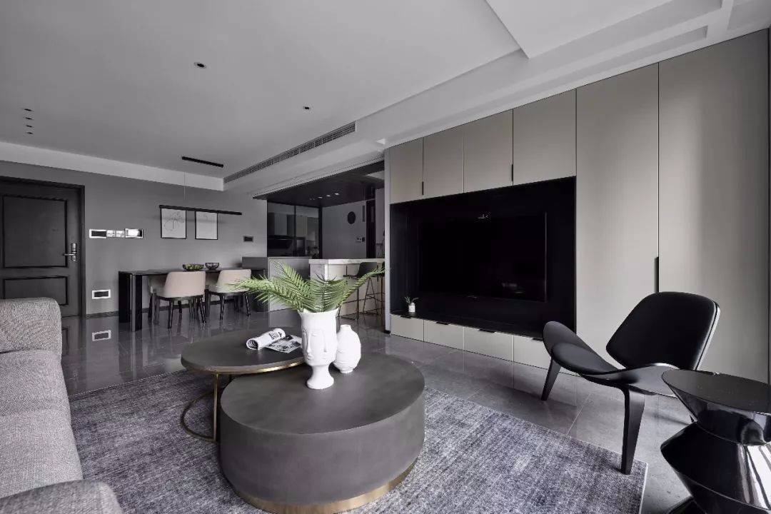暗黑极简之中又有着浓郁格调,说的就是男主家这样的风格了,虽然看去没有太过明亮的颜色点缀,但黑白灰三种颜色的层次叠配,客厅丝毫不显单调