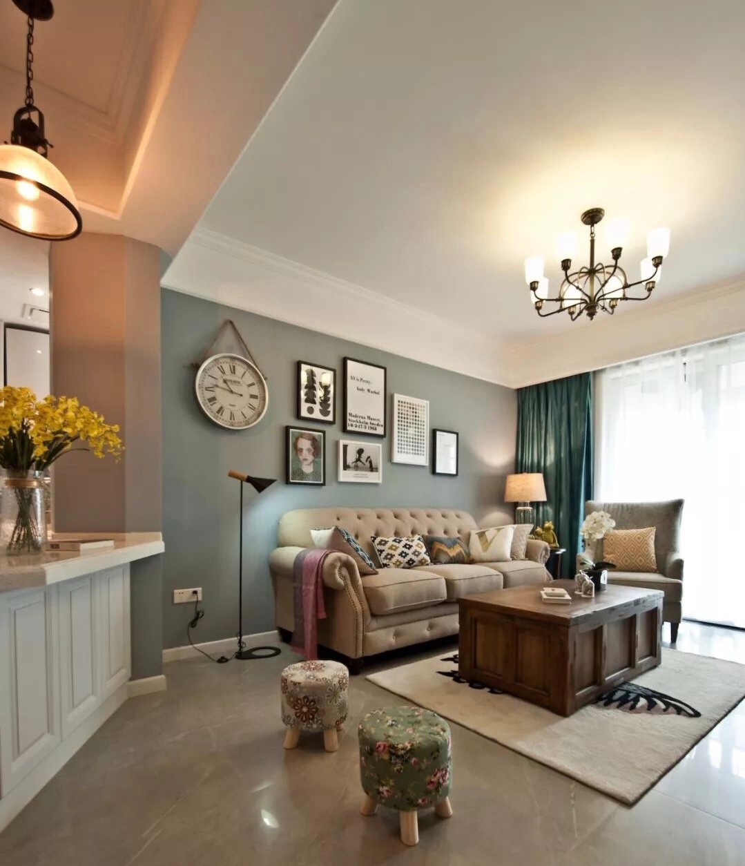 原户型是比较中规中矩的户型,正南正北朝向也比较不错,唯独一点就是门厅光线比较暗一些,所以从整体结构做了整体改造,厨房改为了开放式厨房,而且原先没有比较合理鞋柜的位置,为此把次卧的结构做了改造,做了定制的内嵌鞋柜,整体风格采用简约美式风格营造温馨舒心的氛围。