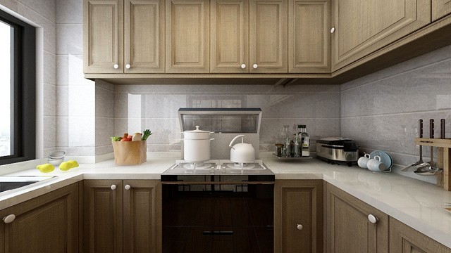 4厨房L形的橱柜刚好满足正常的生活需求不浪费一点空间 整体素净、优雅。