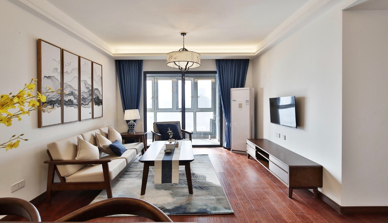 沙发和装饰画配上地毯,一个空间的生命力就浮现出来了,客厅点缀了青花瓷蓝色抱枕和蓝色窗帘,用来贯彻全案。