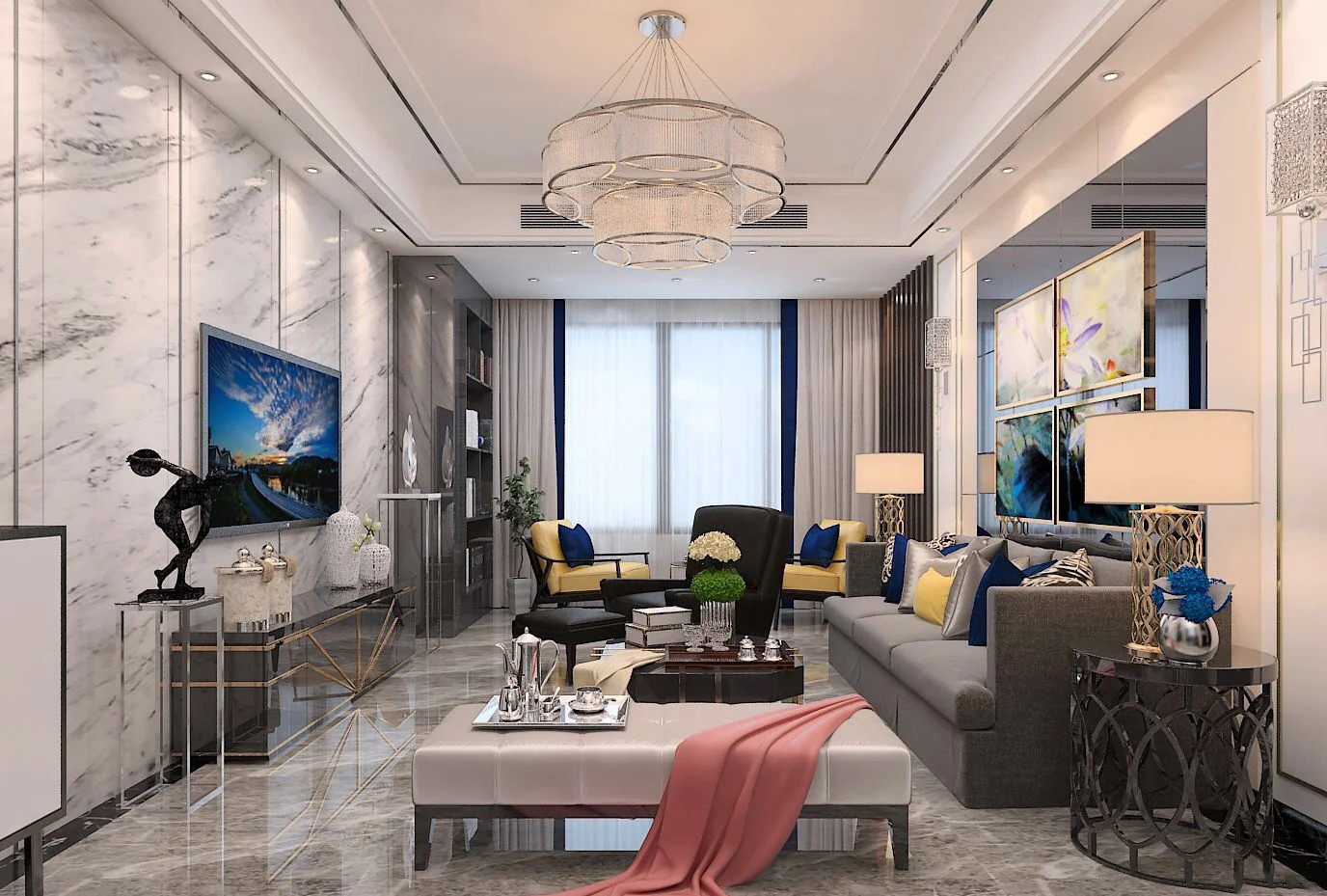 客厅把阳台空间收纳进来,延伸空间。电视背景墙是大理石细腻灰白的纹理,与大理石地砖相结合,十分有质感。线条和金属元素的巧妙运用,让空间整体华丽大气。