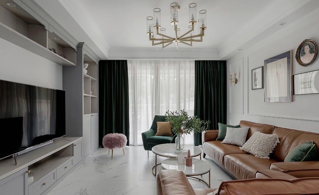 客厅为了提升空间的亮度,地面通铺哑光的爵士白地砖,清爽的白墙加上简单的石膏线条,呈现美式ins风格