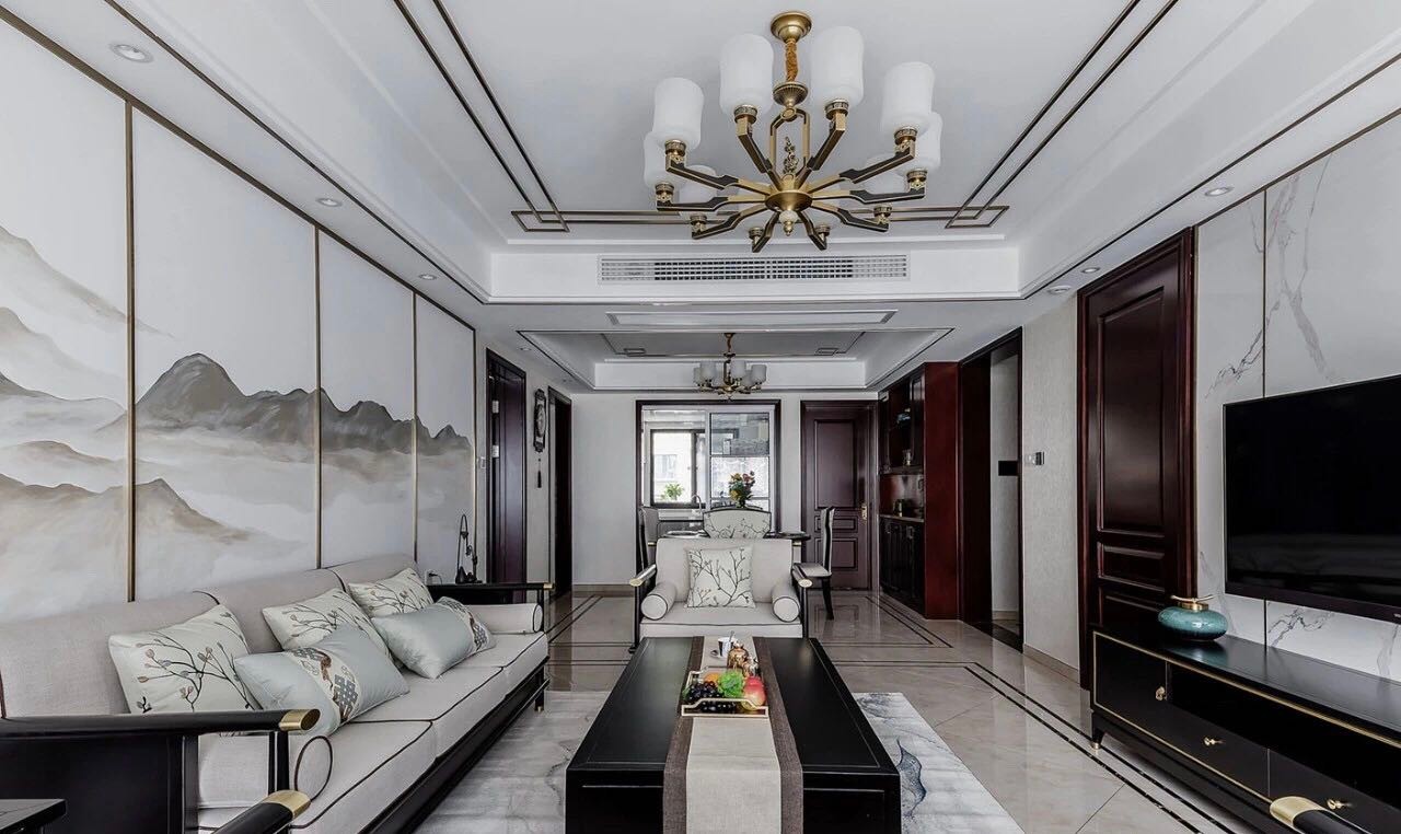 客厅古色古香的中式风格与简单素雅的现代格调自然衔接,大面积落地窗为空间带来明亮,金属条中式走边吊顶与吊灯,多了时尚现代感