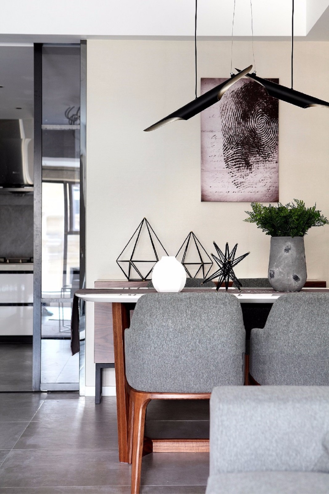 个形吊灯在餐桌上,像两只小鸟飞翔,与自然融为一体。