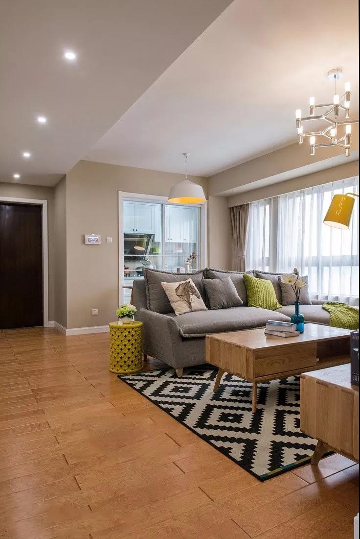 灰色沙发搭配北欧风格的地毯配上原木色茶几,给人一种时尚的高端氛围