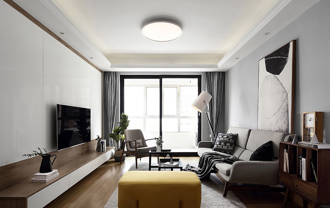 电视背景墙以木色+亮白色搭配,定制的电视抽屉柜也解决了客厅的储物需求,也可作为展示区域。