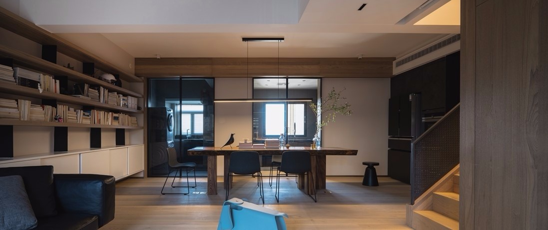 一回家就能看到开阔的客餐厅空间,因为墙体的拆掉,让自然光线可以在空间中自然流窜,客厅窗帘采用百叶的方式,可以任意调节室内光线的明暗。屋主家藏书比较多,我们在客餐厅靠墙背后设置一排6.5米长的书架,上部分为开架形式,方便平时生活中对物品的取放,下部分为悬空推拉门柜体,方便机器人平时工作的打扫。一整面墙都是收纳空间,收纳很充足。