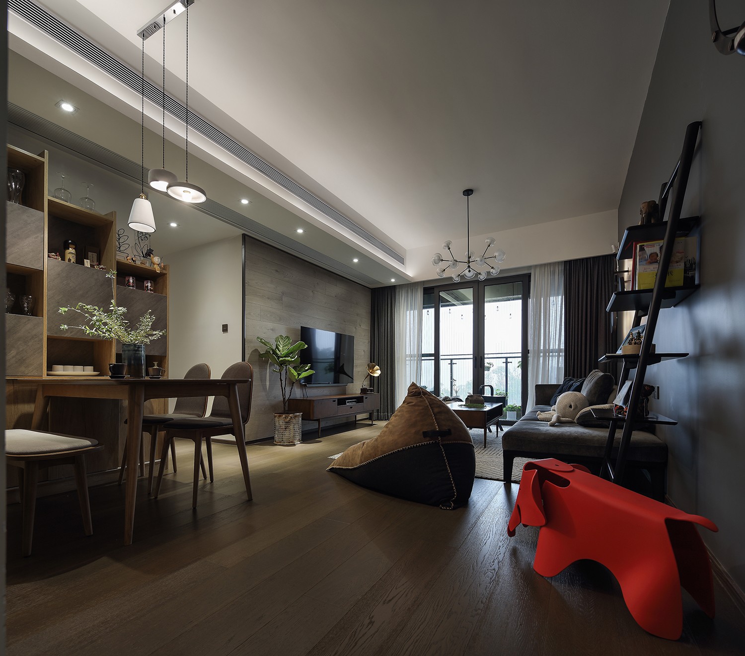客厅的基调随着木地板定下了深色度,像深夜的橱窗,耐人寻味。