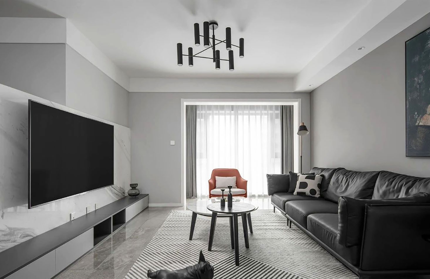 黑色真皮沙发搭配橙色单椅,灰色墙面用艺术抽象画点缀,采用色彩分散呼应营造简约不失活力的生活美学