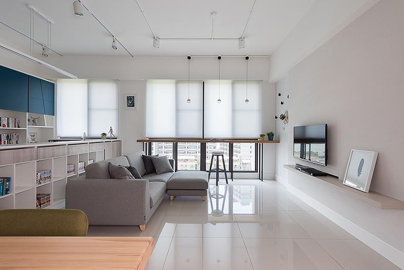 白+ 蓝+ 绿色植栽+ 书墙是男主人与女主人的喜爱与机能需求