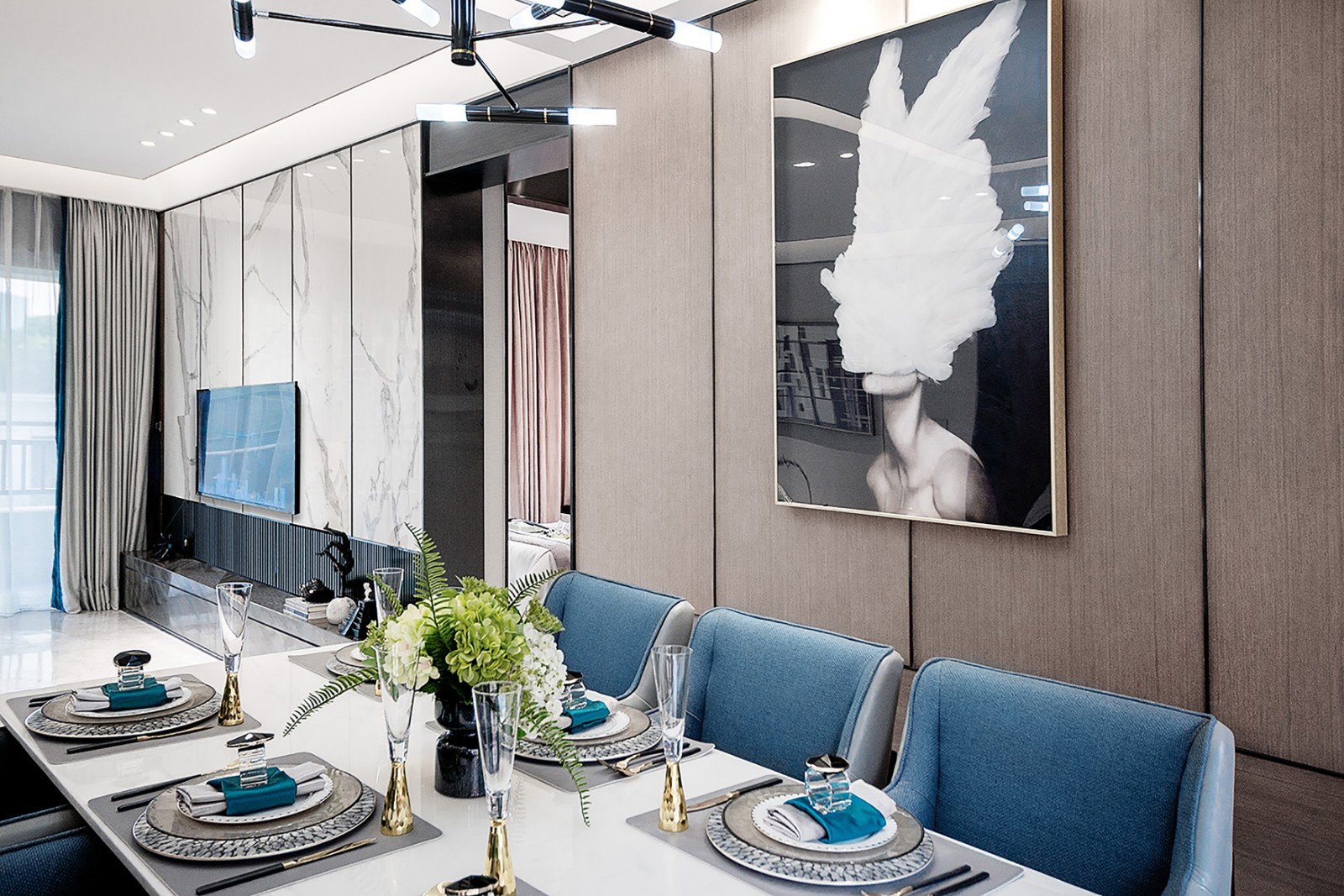艺术的成功就在于能够传达人内心隐匿的思想,将现代情趣搬进居住空间,以灵魂画手的姿态勾勒出一副动人心弦的画作,尽管是以不同形式风格主题的挂画题材组合搭接,但这正是设计师刻意而为之的点睛之笔,传达出现代情怀的个性与独特。