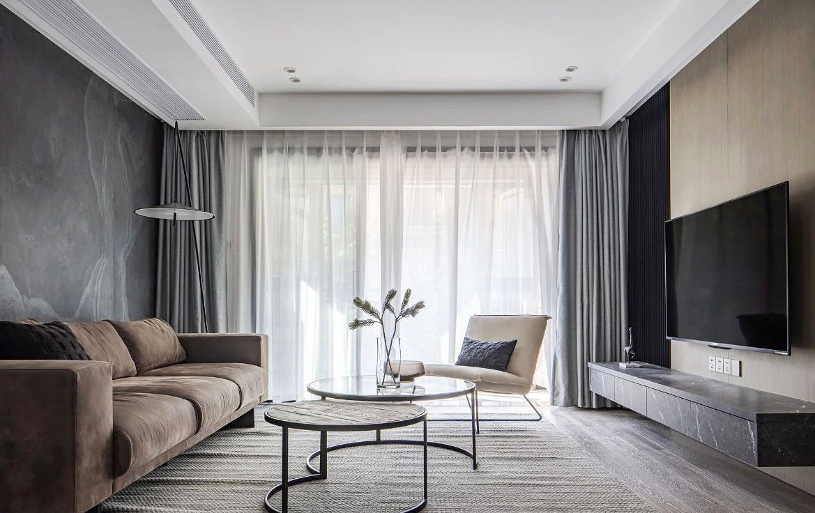 采用无主灯设计,让整个空间看起来更加开阔,电视背景墙采用咖色木饰面与黑色波浪板的搭配,兼具优雅与时髦感,黑色+石材纹理的电视柜,带来时光的印记,给予空间强烈的视觉冲击,悬空的设计可以增加更多收纳,在视觉上也为空间营造轻盈感