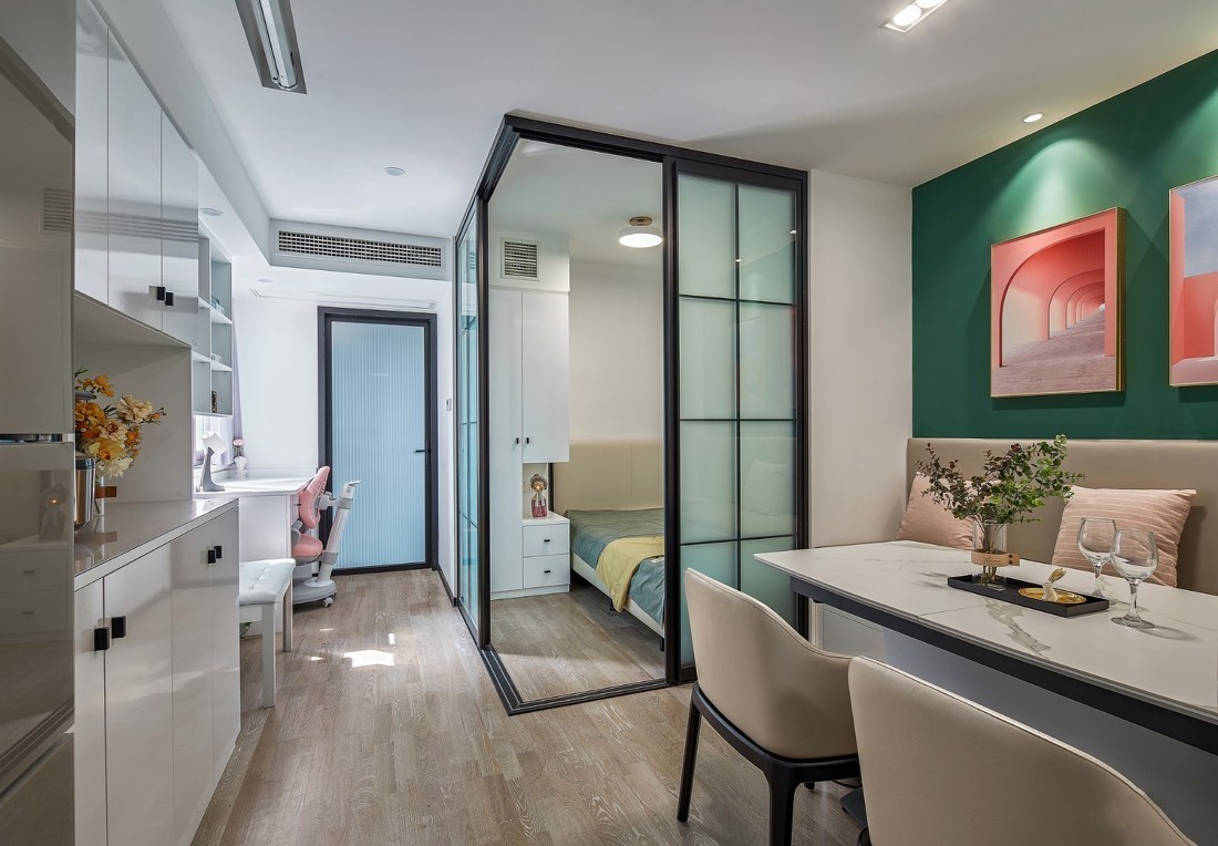 小户型的客餐厅也是整个设计中最难设计的地方。小小不到10平方的空间,要优雅的融入沙发、电视、餐桌等,这对任何一个设计师而言都是一个巨大的挑战