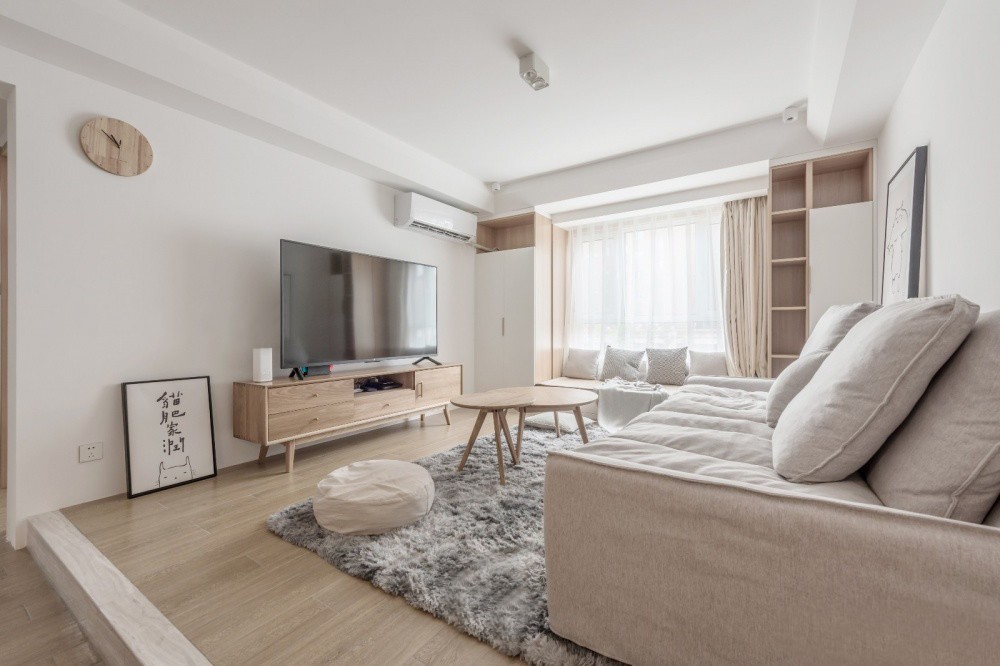客厅整体以白色为主调,搭配温润自然的原木家具,简约而舒适。
