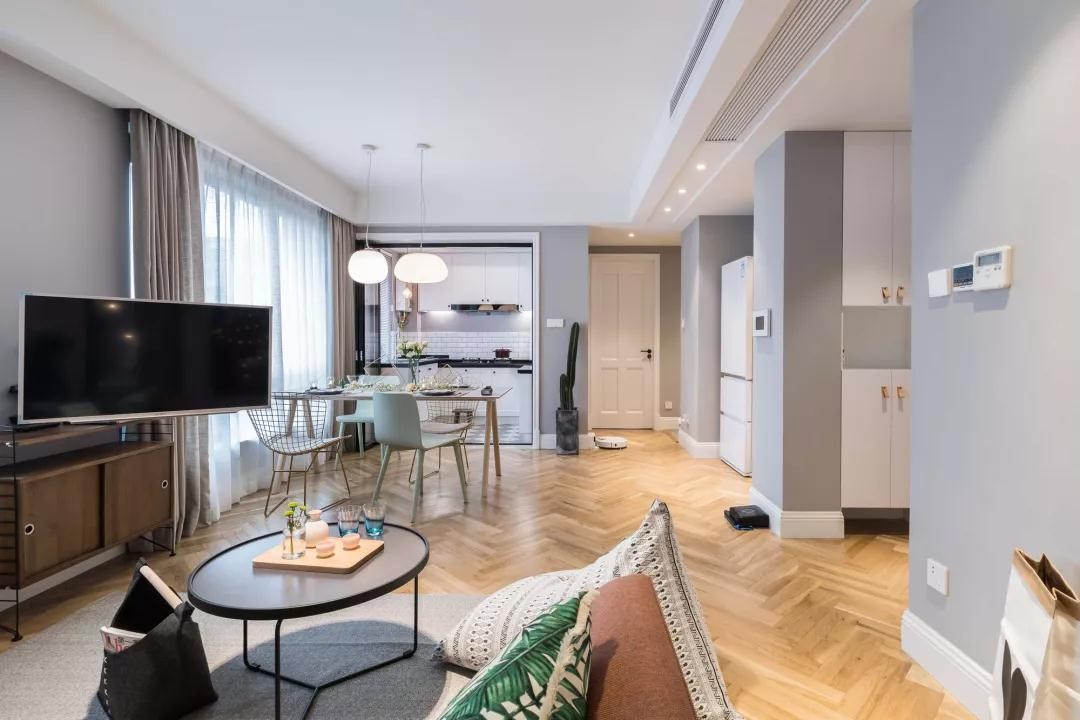 客厅的整个色调分为三个部分,一是墙面的浅灰色,低调中又带点清新,二是吊灯的纯白色,干净大气,三是地板上的木色,三个颜色形成三个***块,地板砖的拼接方式拉伸了客厅的纵深感。