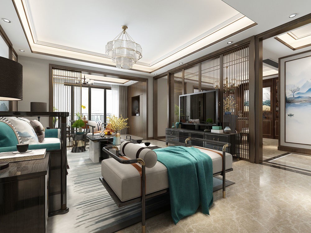 客厅沙发背景墙采用了中式屏风元素,吊顶采用了金条点缀与地面米色大理石相结合,新中式的沙发跟灰色地毯搭配,整体看起来效果既现代又不失中式沉稳大气!