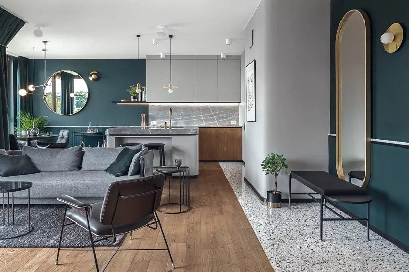 客厅在木地板上铺了深灰色的地毯一张灰色的双人沙发黑色大理石茶几,深绿色的抱枕整个搭配、颜色都呼应着主题风格