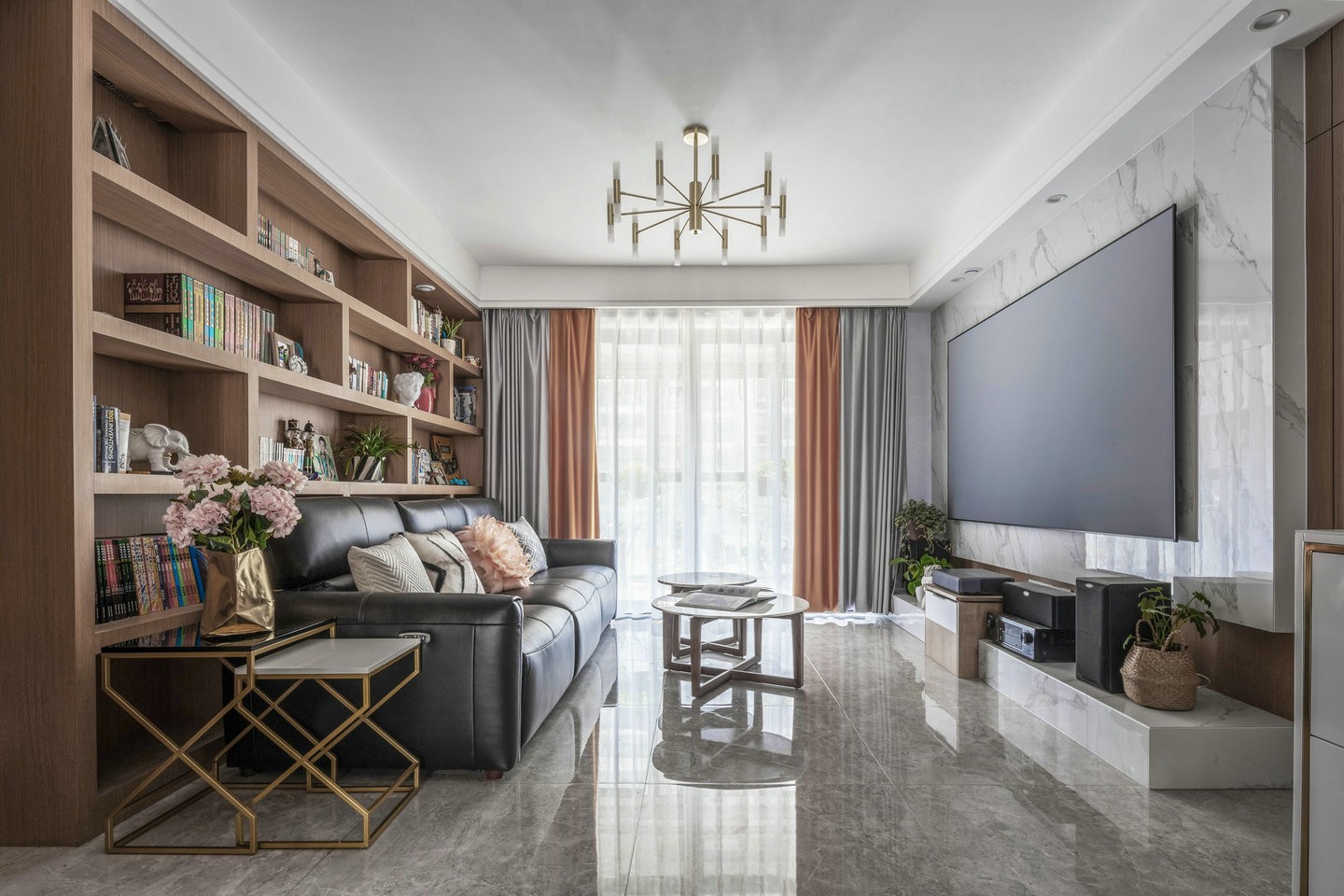 由于现代风格线条简单,装饰元素少,需要家具结合软装完美的搭配空间,才能显示出美感,屋主夫妇钟爱于读书,沙发背景大面积的书柜兼顾储藏和装饰的作用,考虑到空间的整体性