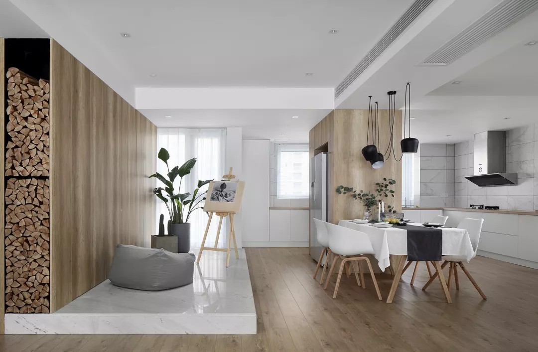 开放式餐厨以白色为主色调,辅以原木色进行搭配,左侧还搭载了一个抬高的休闲区,整体宽敞明亮,餐厨一体的设计让空间扩容20%!
