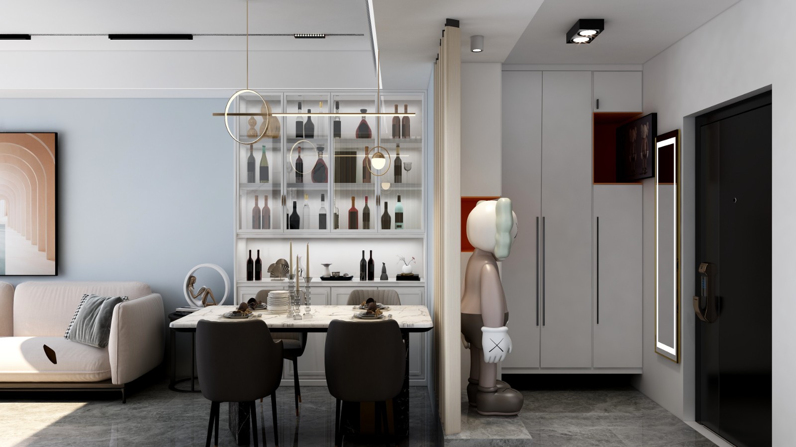 门厅玄关KAWS的雕塑体现男主人的爱好,增加空间趣味性,