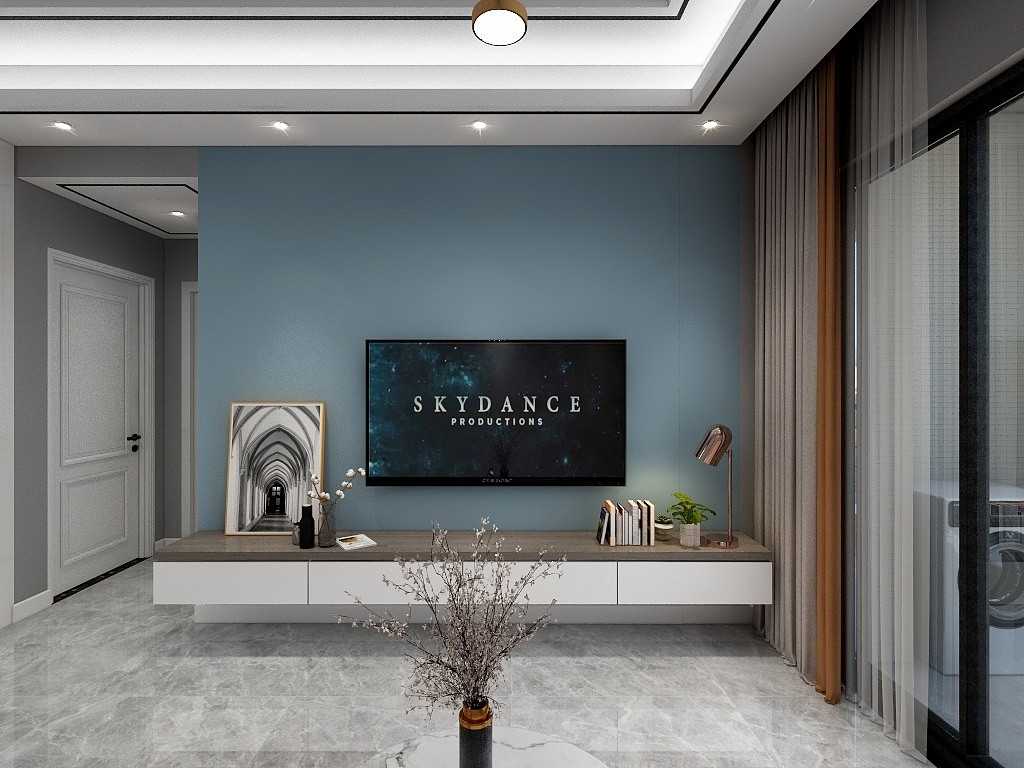 电视背景墙按业主喜好,以简单为主,刷了业主喜欢的灰蓝色,做了一排木色悬空地柜,让整体空间不失活力