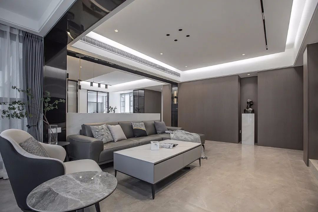客厅使用了多种材质,石材、木质、金属、布艺等元素,带来视觉上的丰富变化
