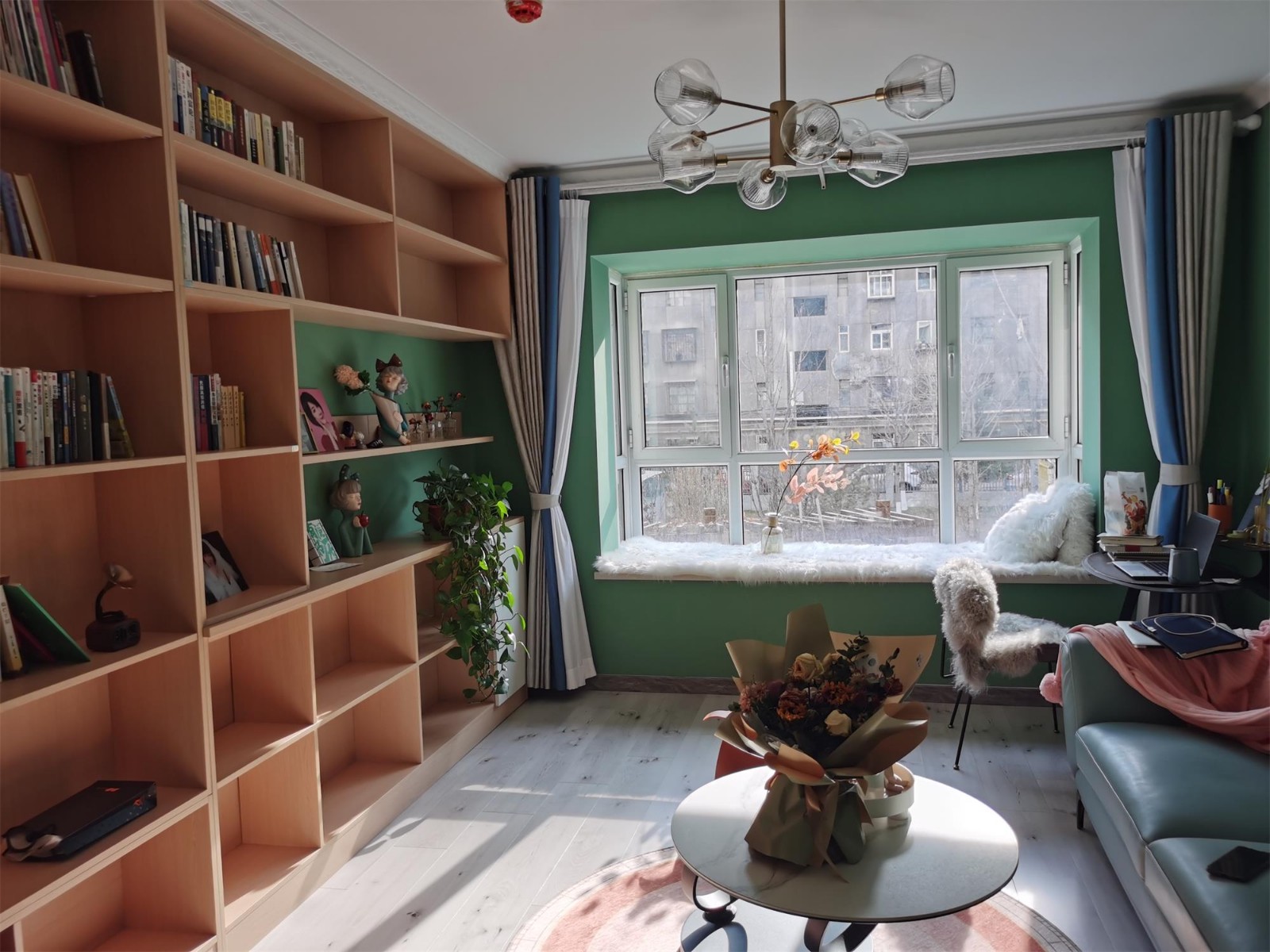 墙面刷了绿色乳胶漆搭配原木色家具,有一种生机勃勃的感觉。