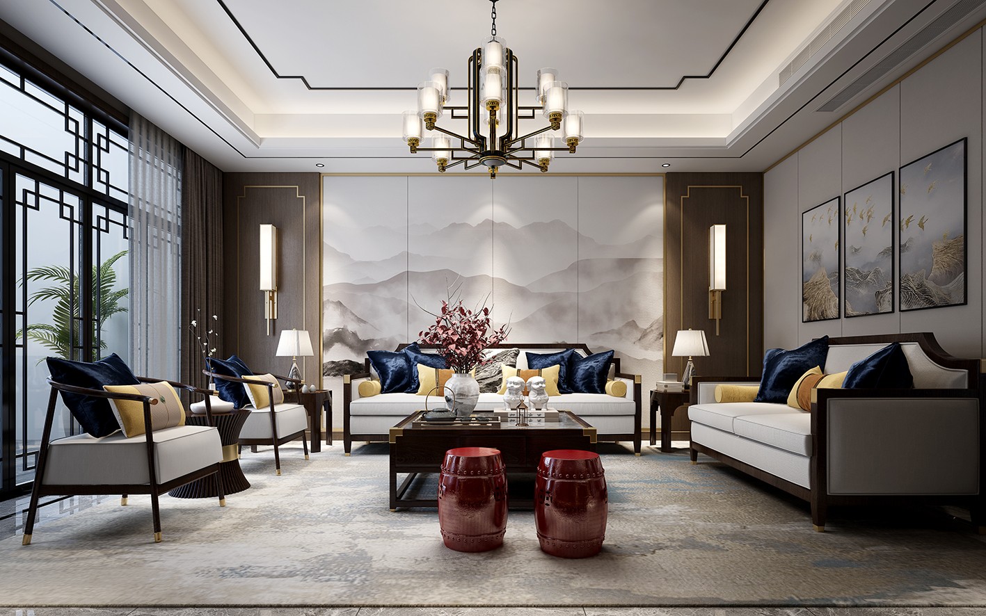 新中式的客厅,予人精神感觉温暖舒适,心情舒畅,透过中式花窗,可以看到南面的庭院,一幅幅美景入目而来;经过中式沙发与白色软装结合,给您一种放松安逸与温暖祥和之情,一盆绿植及古画,白与绿,清与静,祥和的气氛与灵魂共鸣。