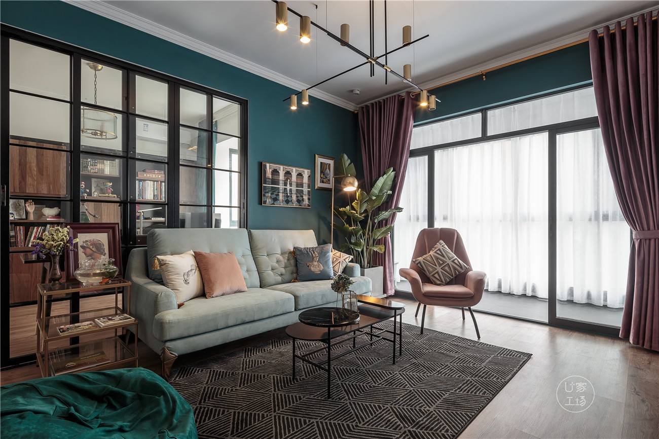 复古风格客厅设计,在色彩搭配方面,墙色选择了深灰绿+浅灰的搭配,和浅蓝色的沙发形成同一冷调,又和脏粉色单人沙发和窗帘形成撞色,使整个空间气质更为沉稳内敛。