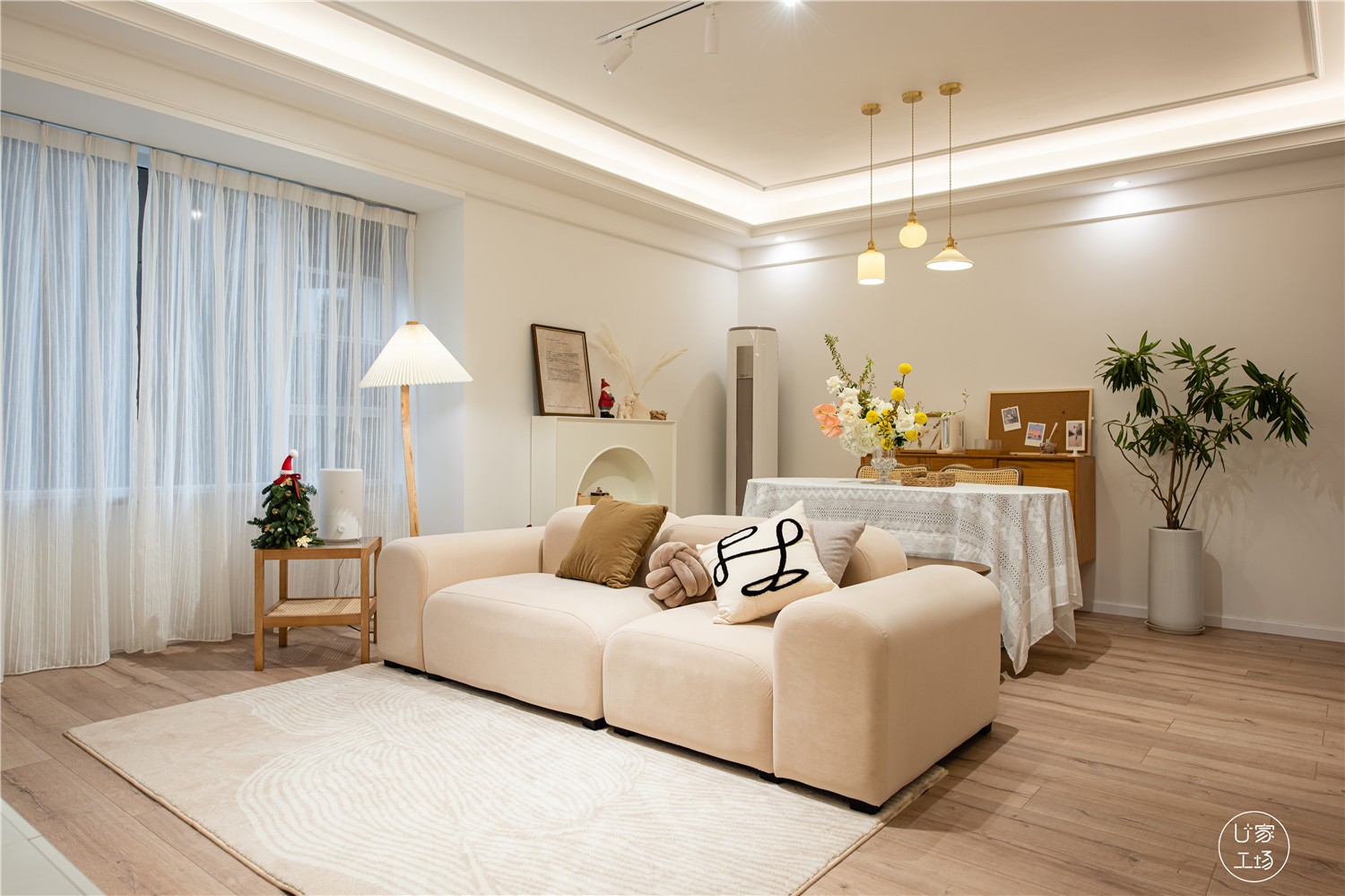 观影情绪一上头,极易出现将脚置于地面的情况,所以紧邻沙发的地板上,再次铺陈了一张日式风和毯。