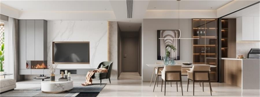 客厅与餐厅连接,整体空间显得宽敞。餐桌旁的餐柜,增加了收纳空间,储物方便。旁边鱼缸内的金鱼作为点缀,给整体空间增加了生机,显得活力。餐厅的味道,除了舌尖上的酸甜苦辣,还有浪漫的环境和别致的情趣。