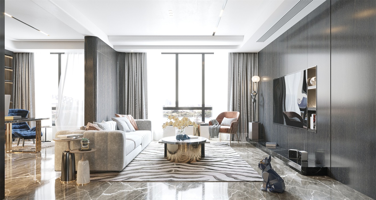 客厅和书房是一个敞开的区域,给人一种开阔的空间感,在格局上显得大气。 如同低调绅士般的***灰,质感轻奢,格调优雅,冷冽简约的空间气质与居住者形成理性和人文的对话。 电视背景墙以大面积的黑灰色为空间主调,加入艺术陈设点缀,虚实结合,张弛有度。