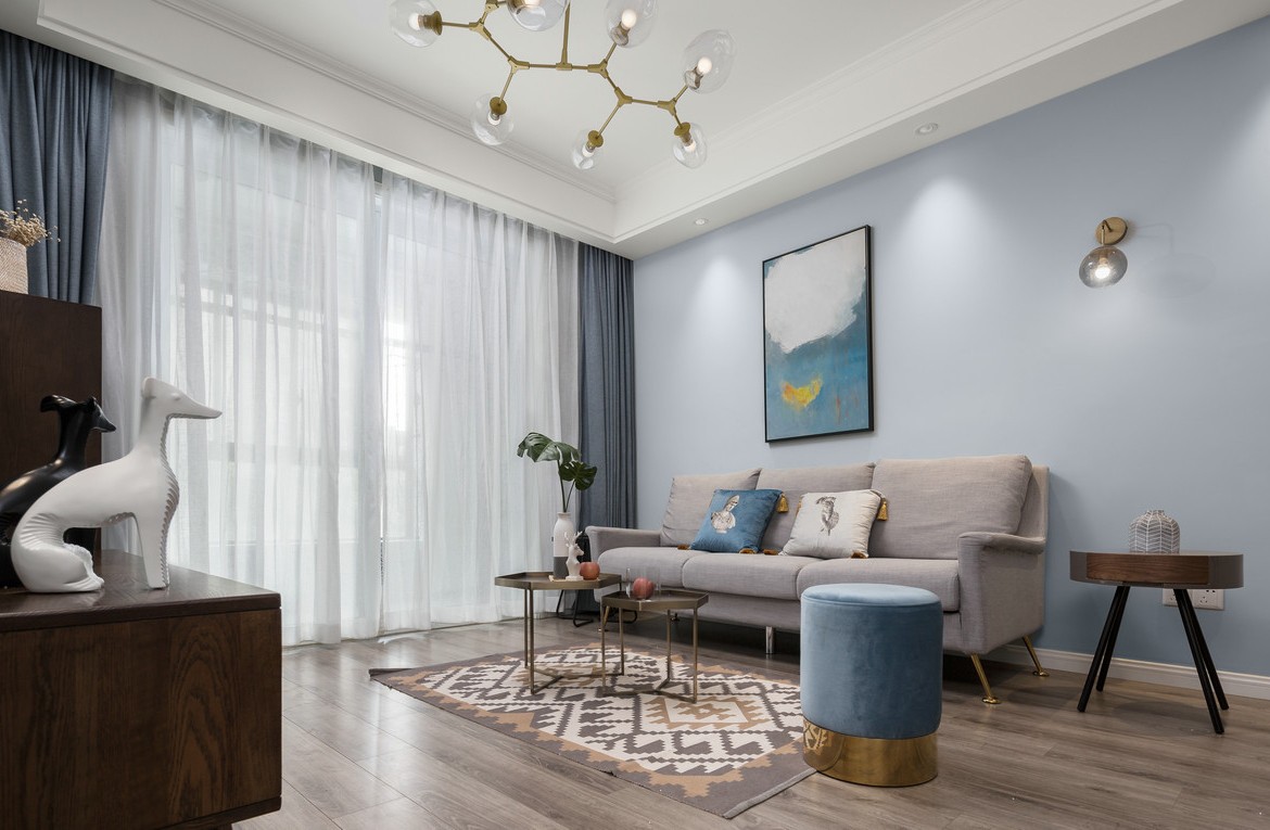 本案户型不大,根据业主的需求和预算最终确定为北欧风格。所以在功能设计上力求实用,简洁,色彩上以清新为主导,以蓝色,咖色作基础色调,软装做提升,最终效果清新恬适。而效果应该是让我们爱上回家。