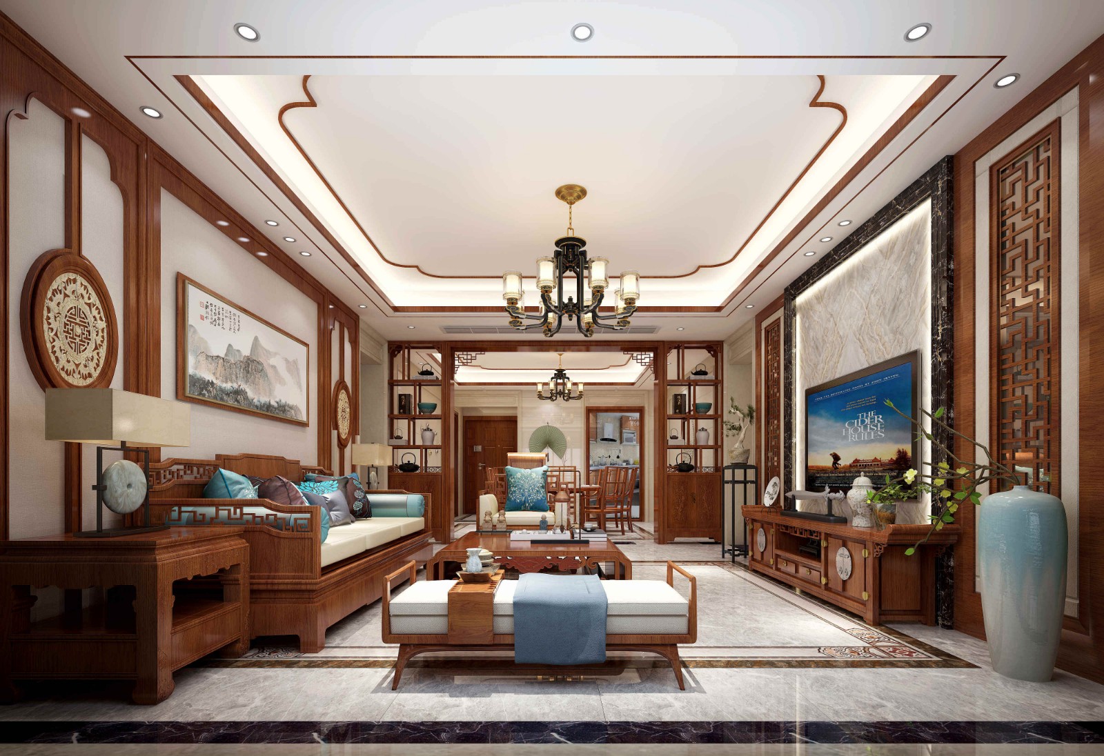 再以一些简约的造型为基础,添加了中式元素,使整体空间感觉更加丰富,大而不空、厚而不重,有格调又不显压抑