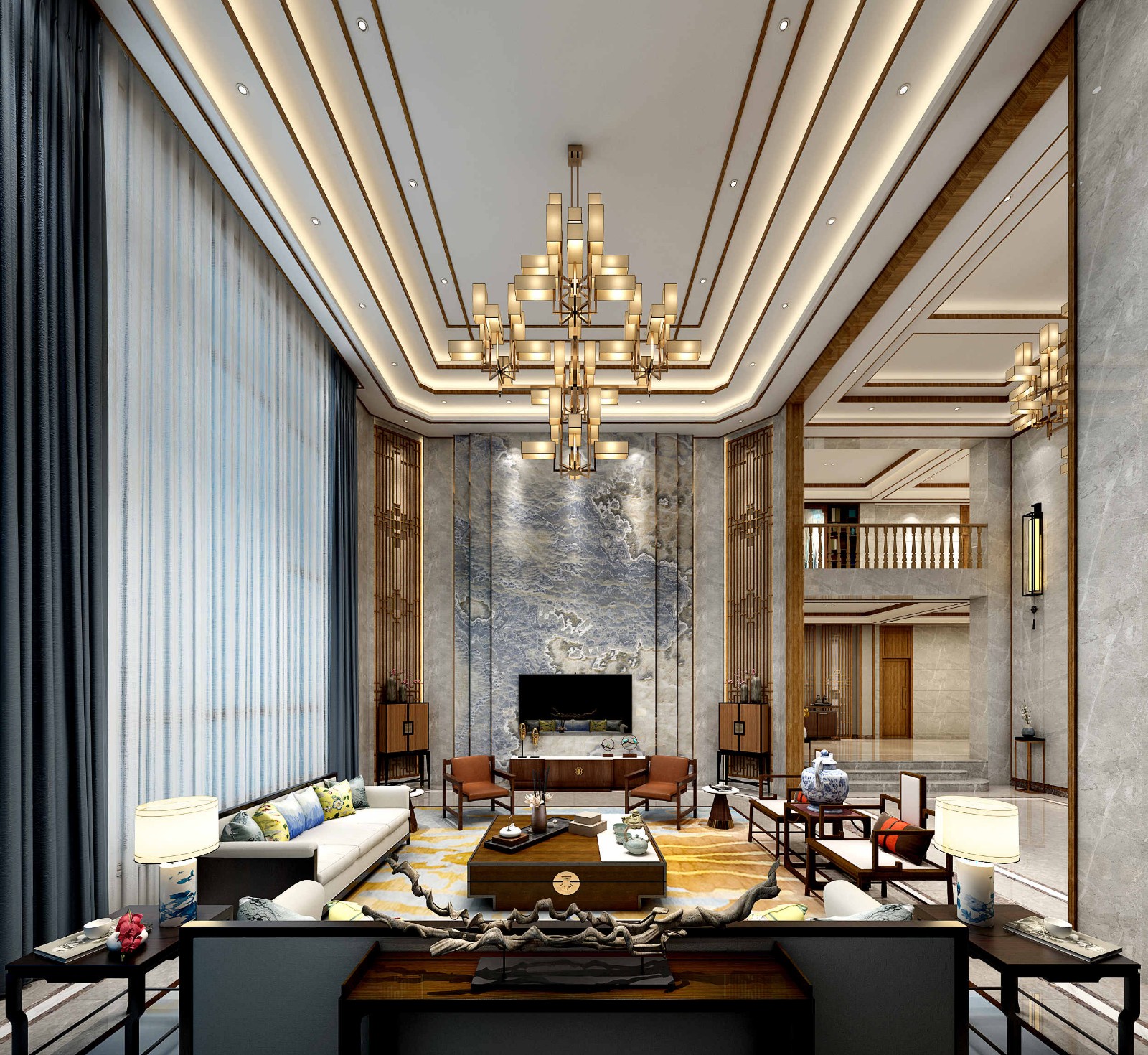 通过现代大方的空间基础,布置上中式格调的装饰与家具,让客厅显得充满现代大方与中式端庄的档次感,这样的新中式风格搭配更加适合事业有成的青壮年人士,可以在居家空间彰显出主人不凡的优雅气质。