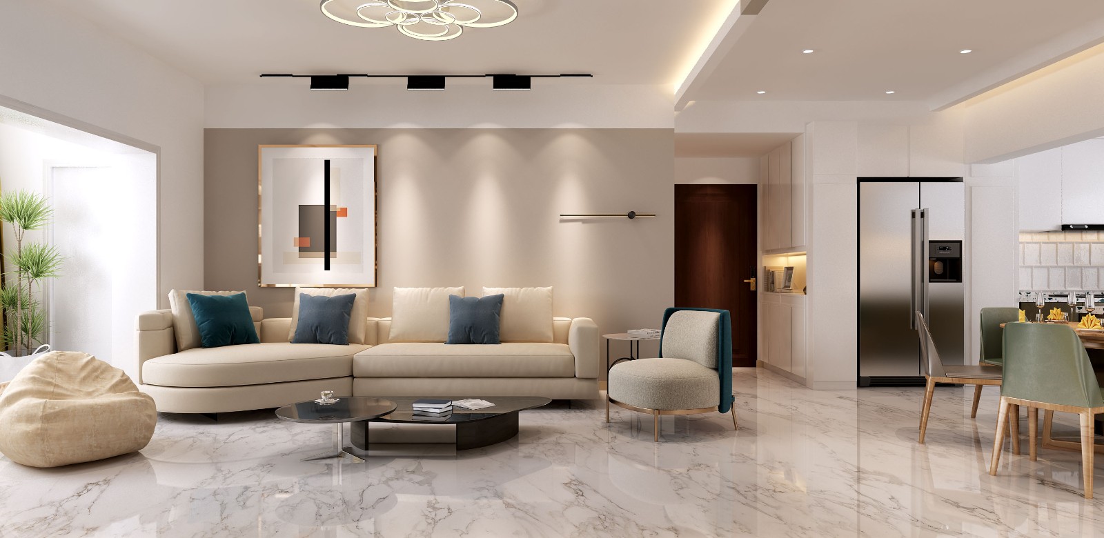 整个设计以白色为基调,搭配不同空间适用的色彩及材质,达到视觉冲击。