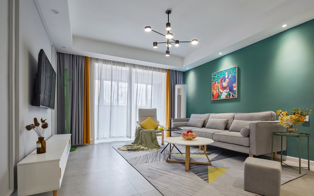 整个客厅大面积运用了灰色、绿色系,搭配高饱和度的抱枕、窗帘,营造了一种可被治愈的温柔感。充满几何条形感的小地毯,给客厅营造一个有趣好玩的氛围。