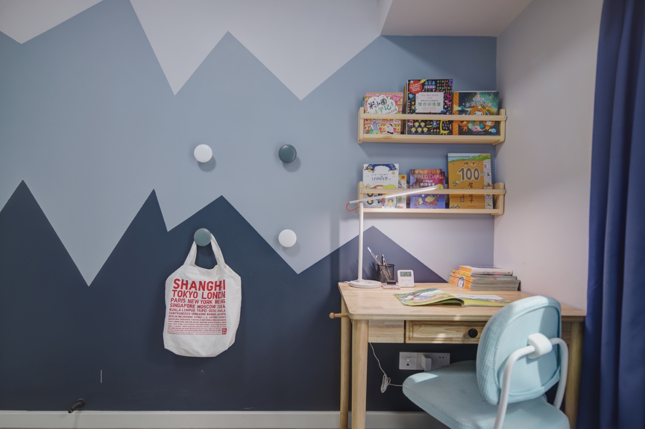 考虑到屋主一家不要电视,只用投影仪,就没有做电视背景墙。客厅区域,一家人可以围坐在一起看书、看电影。