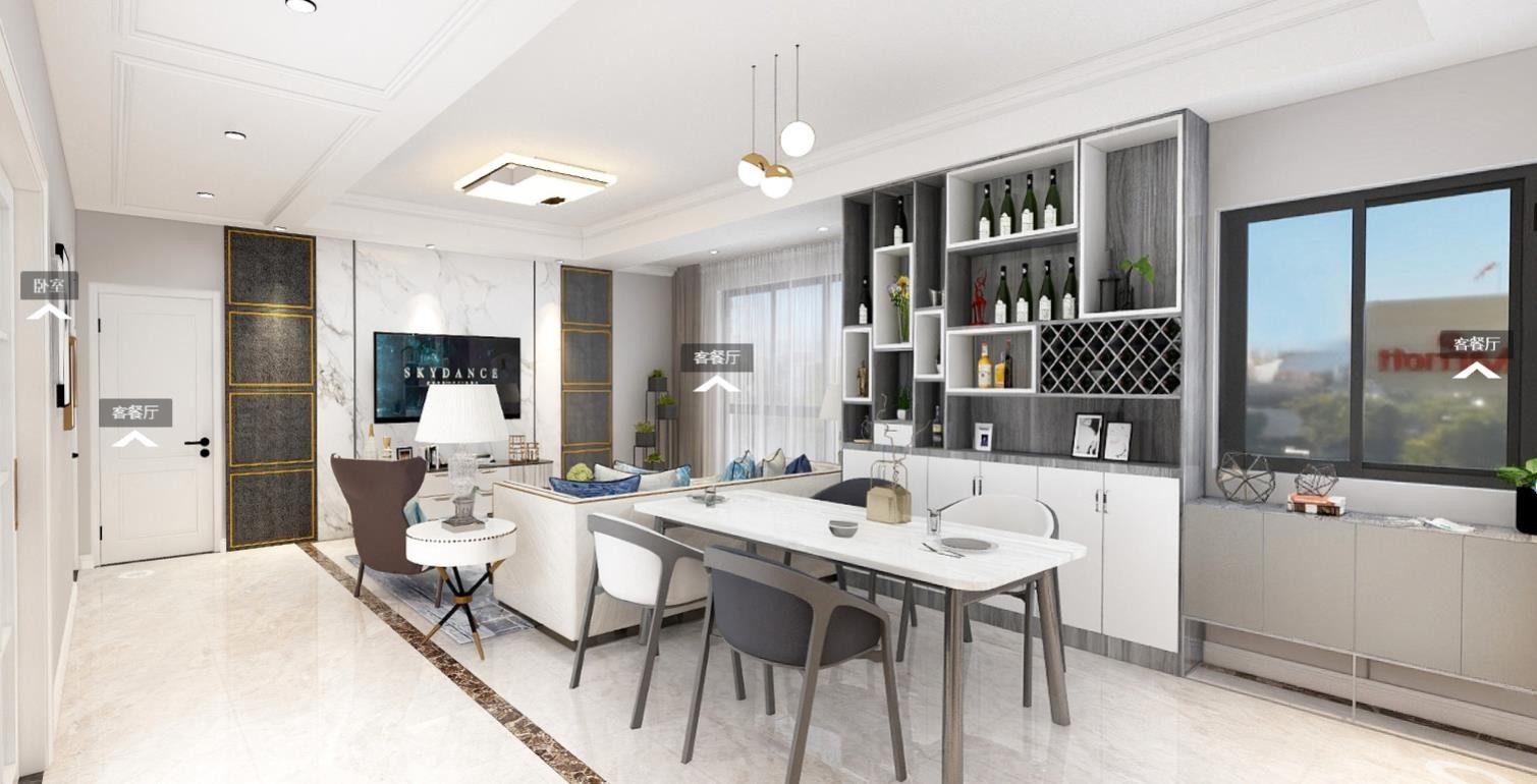 整体设计在于轴线,墙地顶要在一条对称轴,这样的设计才会好看。餐厅旁边窗户很少走到那边去,不如把它利用起来做一个餐边柜加酒柜的设计,大大提高收纳空间又美观。