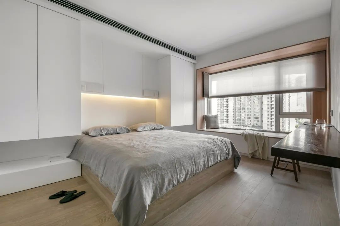 打破传统布局,将衣柜设置在两侧, 过道足有1.2m宽,非常舒适。 床头灯带设计非常适合睡前的氛围