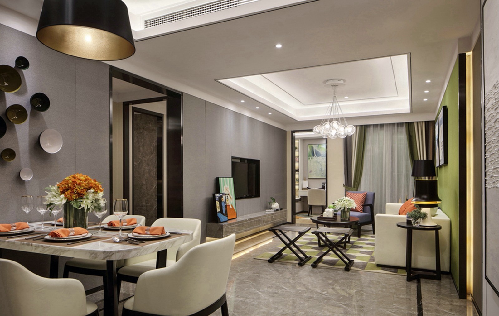 客餐厅中间以过道划分,顶面简单的造型吊顶,衬托出层高。