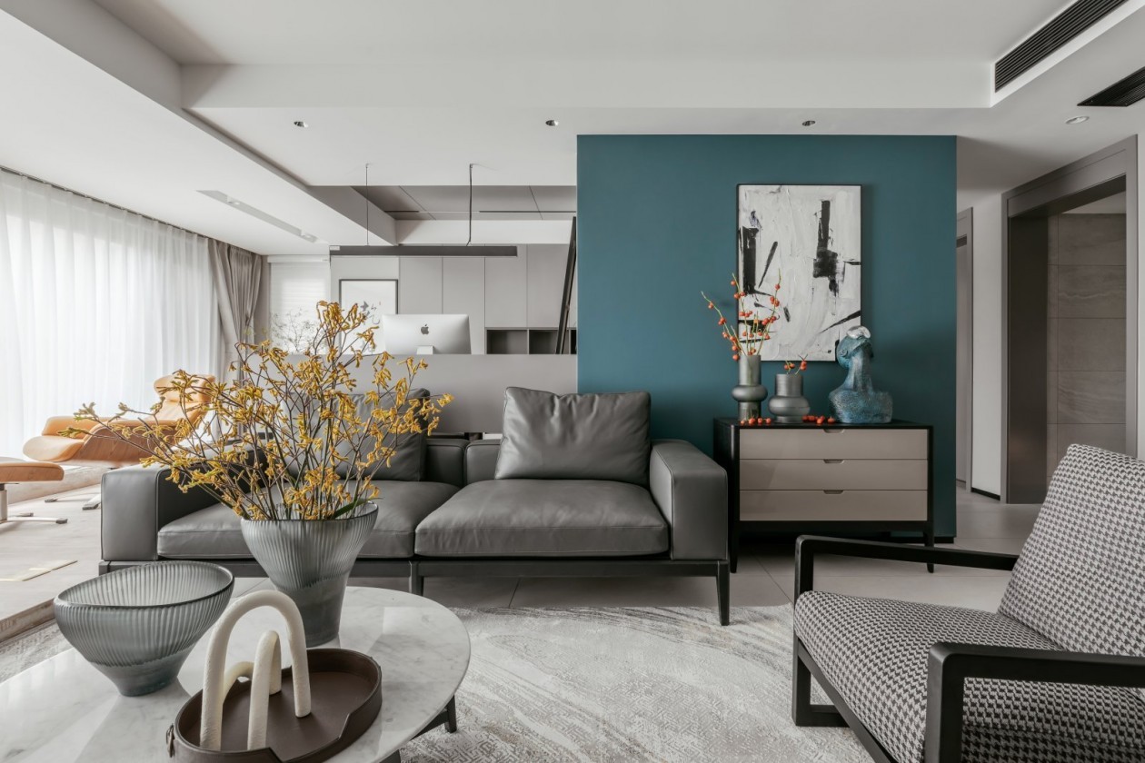 深蓝色的墙面,一股宁静的气息让人瞬间安定下来,也成为这个灰色空间的一抹亮色。造型简洁的矮柜上一幅抽象的黑白画,瓶子里插着几支红透的海棠果。沉静而又充满生机的画面,生活的舒适感在于传达一种轻松的氛围,让人愿意身处在这样的空间中。