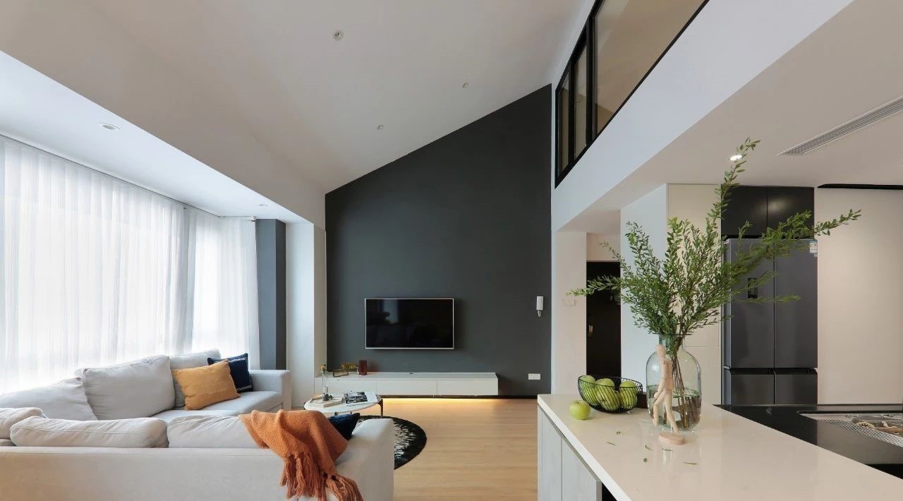 客餐厨全开放,客餐厅区域保留高挑空,露出房子原有特殊结构,在餐厨区借助楼梯结构做一些三角造型的呼应,保留了原有建筑的美。